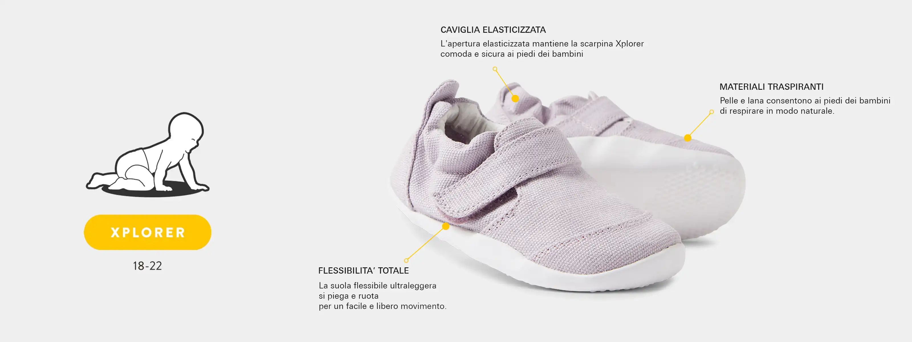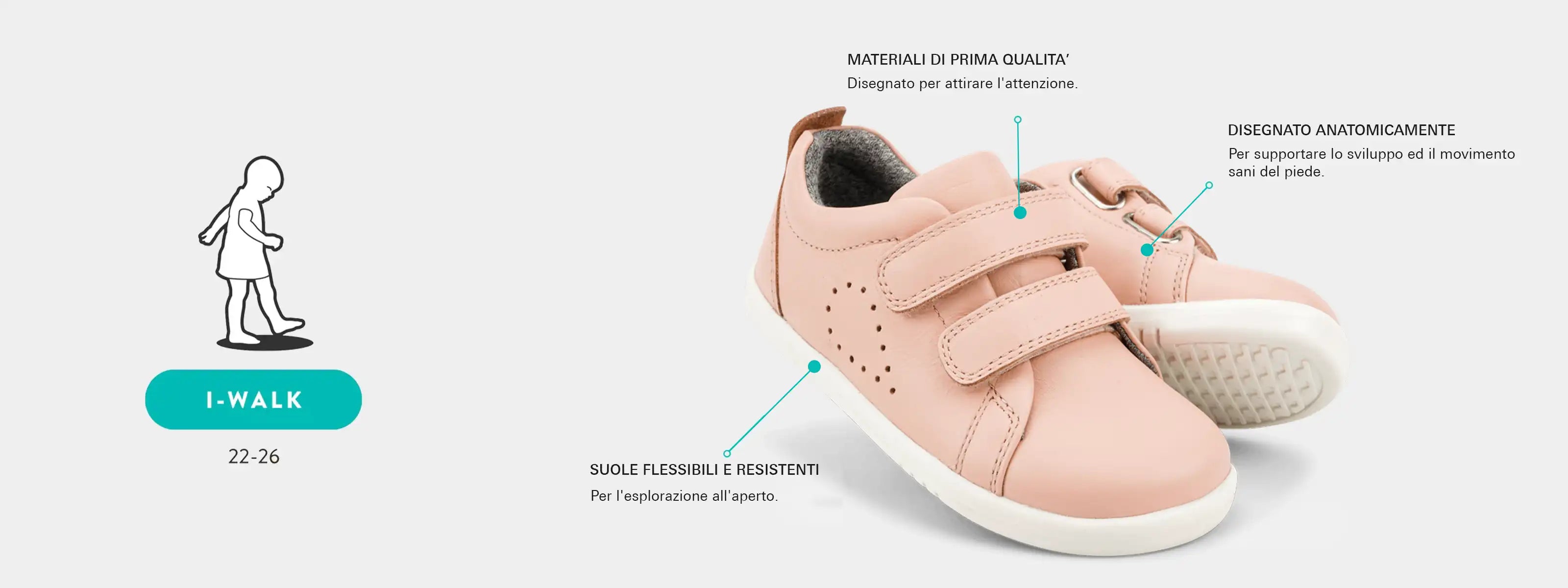 Scegliere la scarpa giusta per il tuo bambino è molto più che trovare esclusivamente la taglia corretta, è importante trovare anche una scarpetta progettata appositamente per qualsiasi fase dello sviluppo in cui si trova. In Bobux, progettiamo le nostre scarpe per soddisfare le esigenze dei bambini per ogni singolo stadio dello sviluppo, garantendo il giusto mix di adattabilità, flessibilità, traspirabilità e vestibilità per aiutarli a crescere e svilupparsi in modo totalmente naturale.